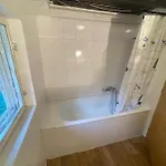 The bathroom features a separate toilet and a shower, along with a hair dryer and bath sheets.